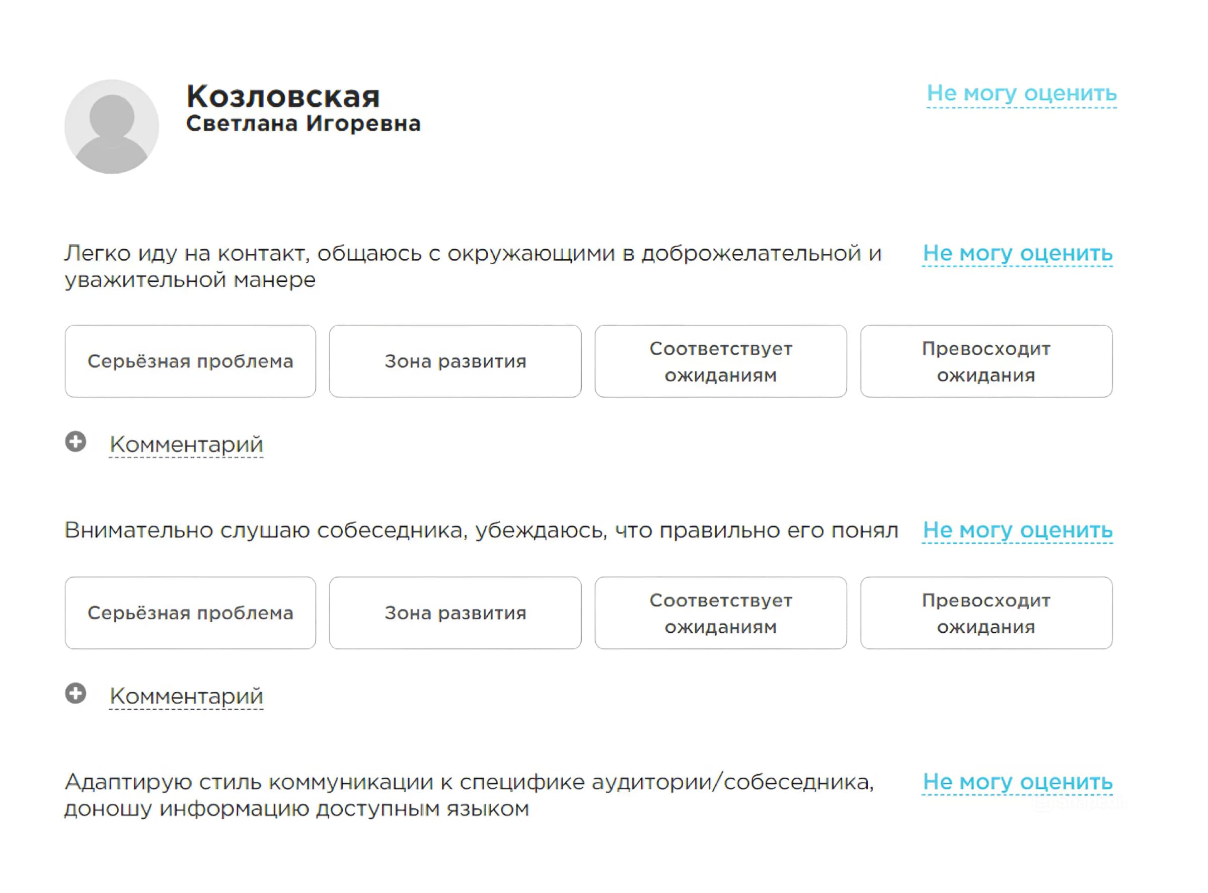 - Интуитивно понятные анкеты. Используйте любую шкалу, понятную вашим сотрудникам и соответствующую корпоративным стандартам.